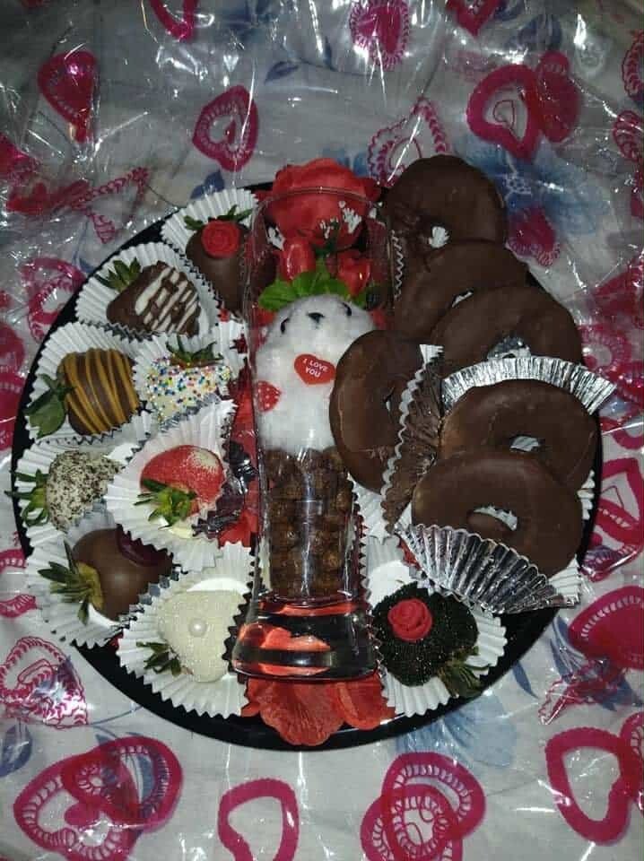 • Chocolate-Dipped Pineapple Slices: Juicy pineapple pieces coated in white and milk chocolate, some shaped like hearts with red accents and others resembling flowers in bright yellow chocolate.